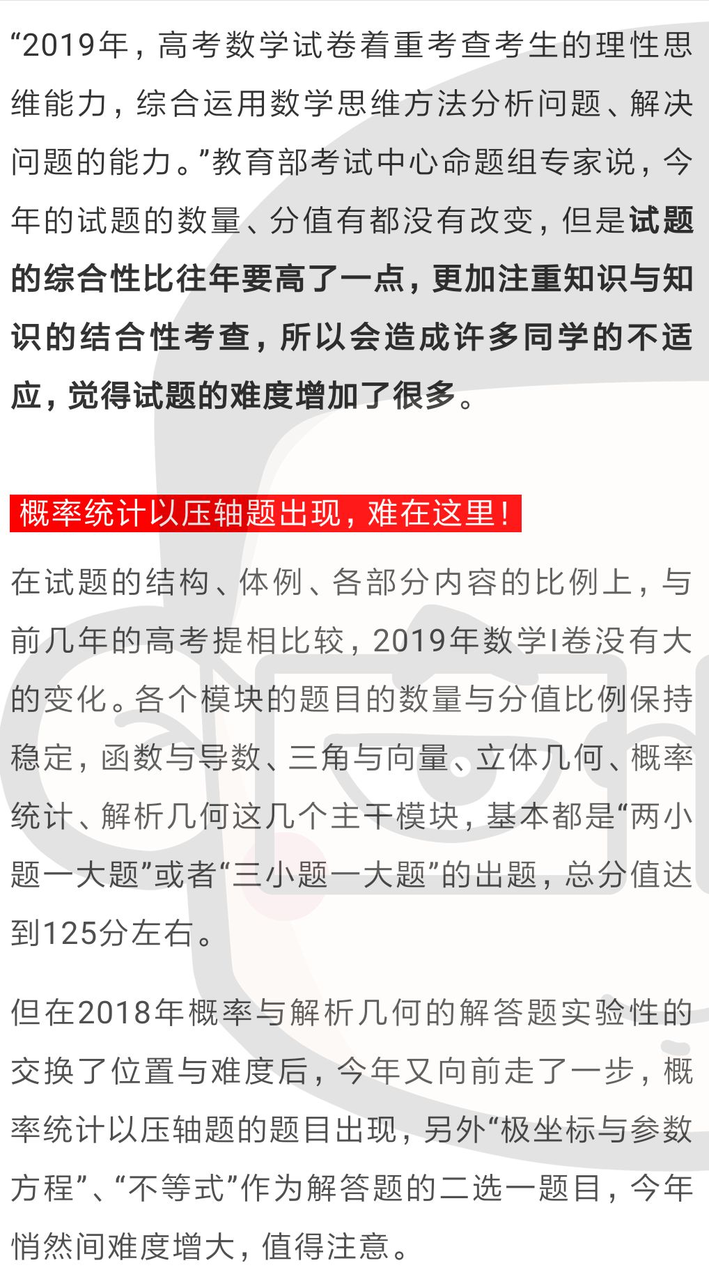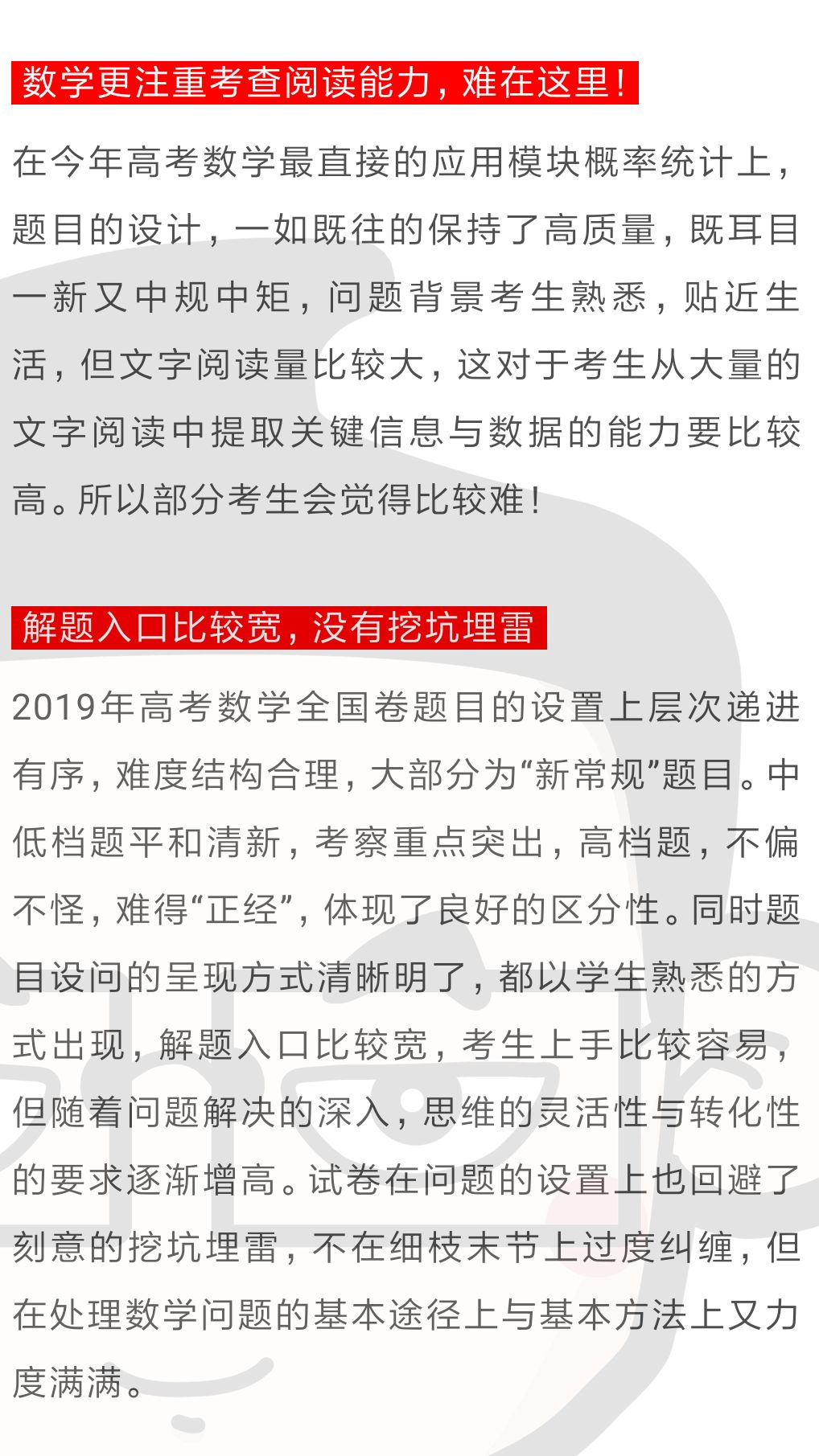 稳中有变,助力破解应试教育。2019年的数学试卷,在整体设计上保持平稳,包括考查内容的布局、题型的设计、难度和区分度的把控等。试题的排列顺序依然是由易到难,循序渐进。在整体平稳的基础上,对主观题的布局进行动态调整。主观题在各部分内容的布局和考查难度上进行动态设计,打破了过去压轴题的惯例。