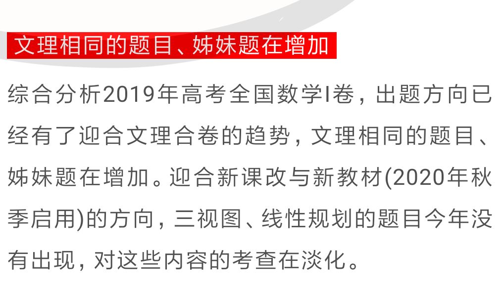 根据通知,2020年高考采取新模式、且已启用新教材的省份(北京、天津、山东、海南),数学用第一类试卷;2020高考采取新模式、但未启用新教材的省份,数学用第二类试卷;2020年高考仍为传统模式的省份,数学仍用原来的全国Ⅰ卷、全国Ⅱ卷、全国Ⅲ卷(文理分科)。如此一来,除自主命题地区外,加上原来的全国Ⅰ 卷、全国Ⅱ卷、全国Ⅲ卷这3套卷子,明年高考数学可能会出现6套甚至6套以上试卷。