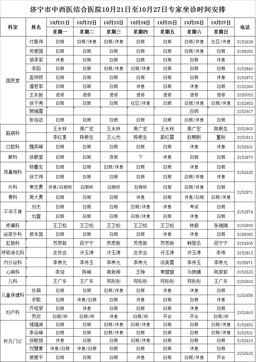 济宁市中西医结合医院本周(10月21日—10月27日)各科专家坐诊时间