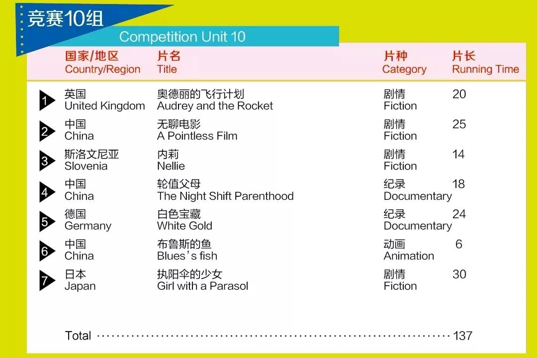 竞赛10组的七部短片分别来自七个不同的国家和地区,包含四部剧情片,两部纪录片和一部动画片。四部剧情片中,中国短片《无聊电影》和斯洛文尼亚短片《内莉》(《Nellie》)用不同的方式刻画了两个家庭各自的处境以及家庭中孩子的内心世界,一个荒诞幽默、一个创意十足。英国短片《奥德丽的飞行计划》(《Audrey and the Rocket》)用精致准确的英式风格讲述了一个老人不服老的故事,展现了老年人对于死亡的不同态度;而日本剧情片《折阳伞的少女》(《Girl with a parasol》)在传统的日式叙事中融入了一丝悬疑色彩,使短片更具层次感。