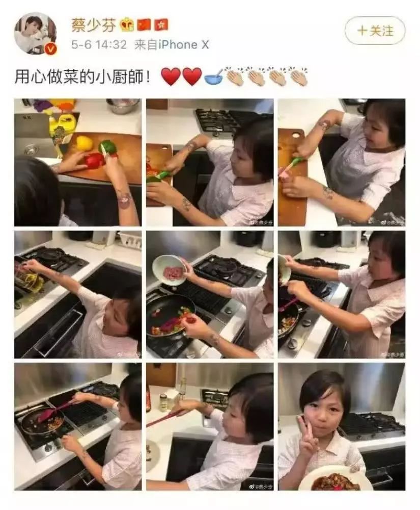 蔡少芬曾在微博上发了二女儿小包子下厨的照片,开心配文“用心做菜的小厨师!”