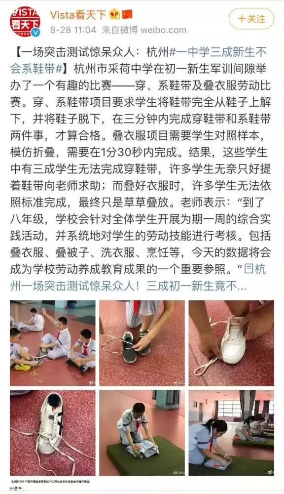 某中学军训,其中有一场比赛是穿鞋带、系鞋带,结果竟然有三成学生根本不会!这不得不让人思考,正确的家庭教育方式该怎样打开?