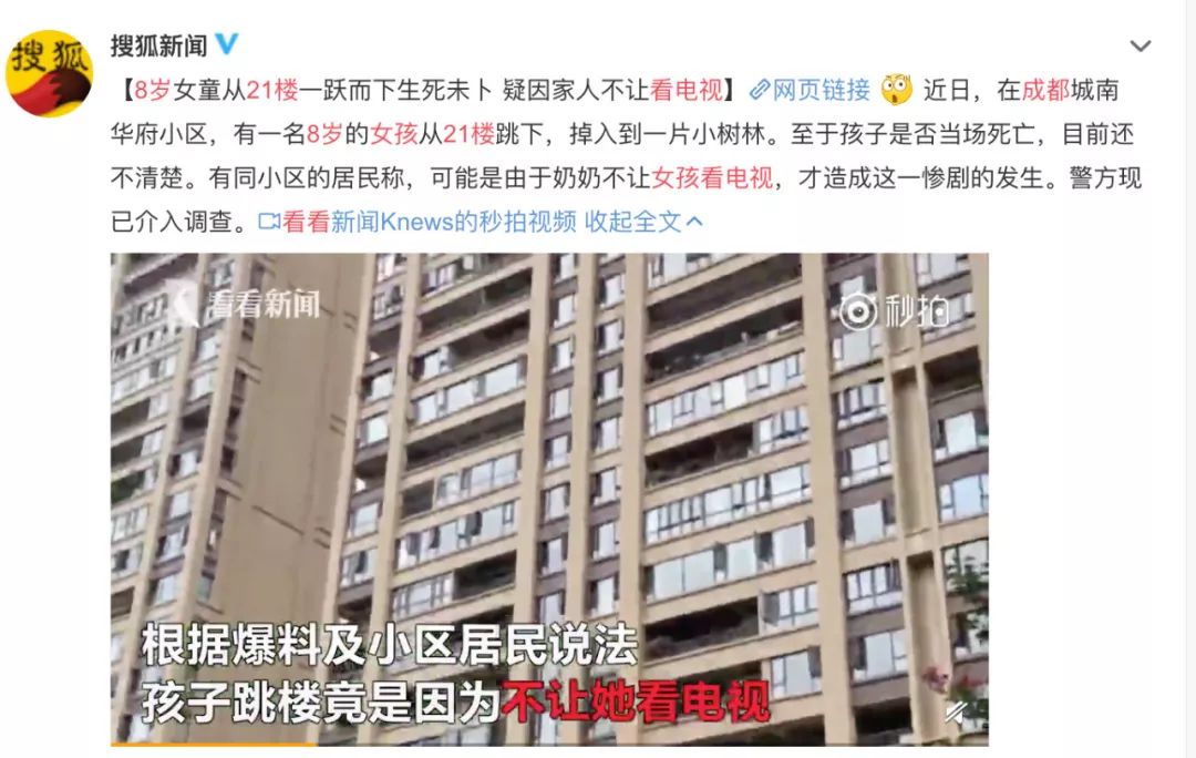 成都一名8岁女童因为看电视与家人发生争执,赌气从21楼一跃而下;