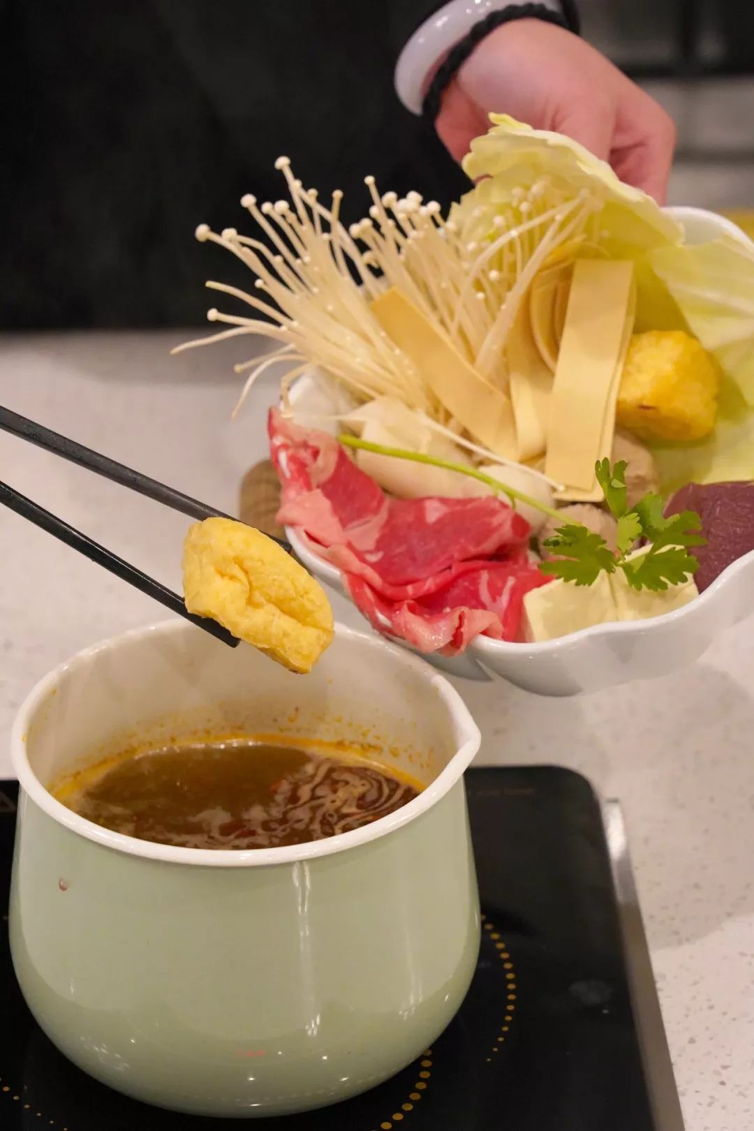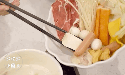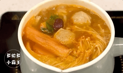 汤底烧开之后,倒入满满一碗的食材,静静等待,汤底的精华全都渗透进了食材里,一尝就能体会到食材的新鲜带来的不一样的绝佳口感。