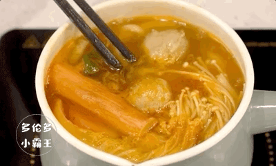 起司片慢慢融化在锅里,熬煮一会后汤底会变略浓稠,咸香十足。小火锅配的鱼豆腐和蟹柳棒蘸上带有芝士奶香味的汤底,香甜浓郁超级治愈!