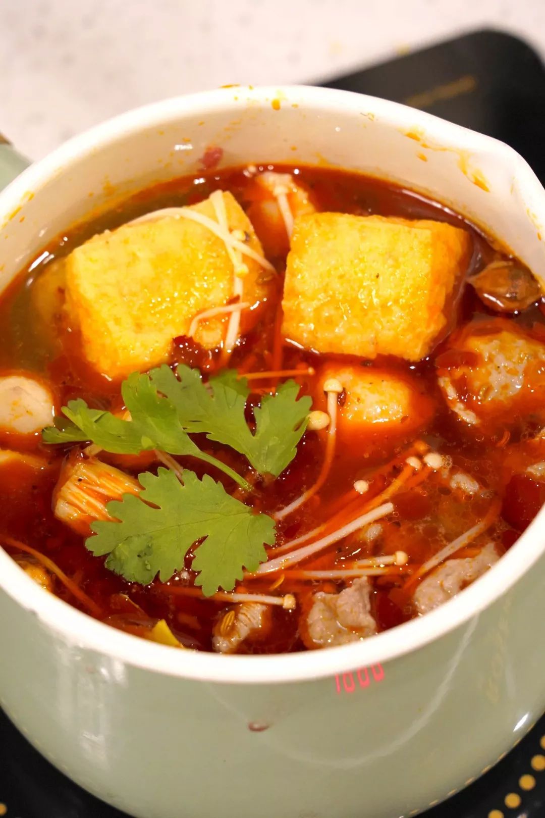 沸腾后汤底冒着红通通的泡泡,辣椒的迷人香气让人垂涎欲滴,吃掉这一锅红亮清透的小火锅,整个人都变得精神抖擞!