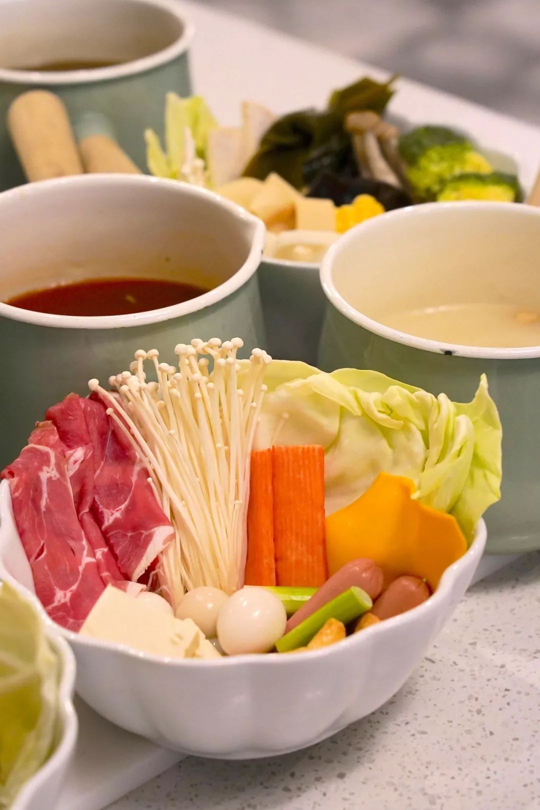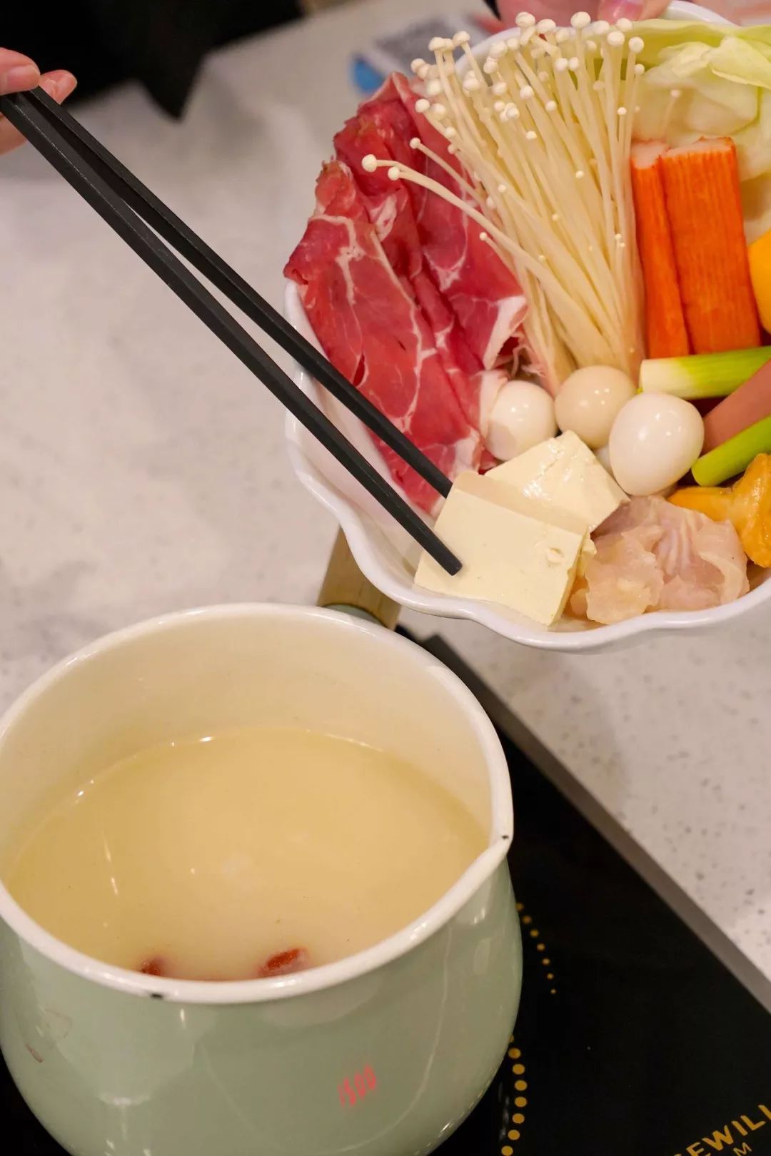 咕噜咕噜!冒着泡泡的起司牛奶锅发出让人无法拒绝的奶香味。由牛奶、椰浆,还有猪骨浓汤熬制而成的汤底,味道清爽又细腻。