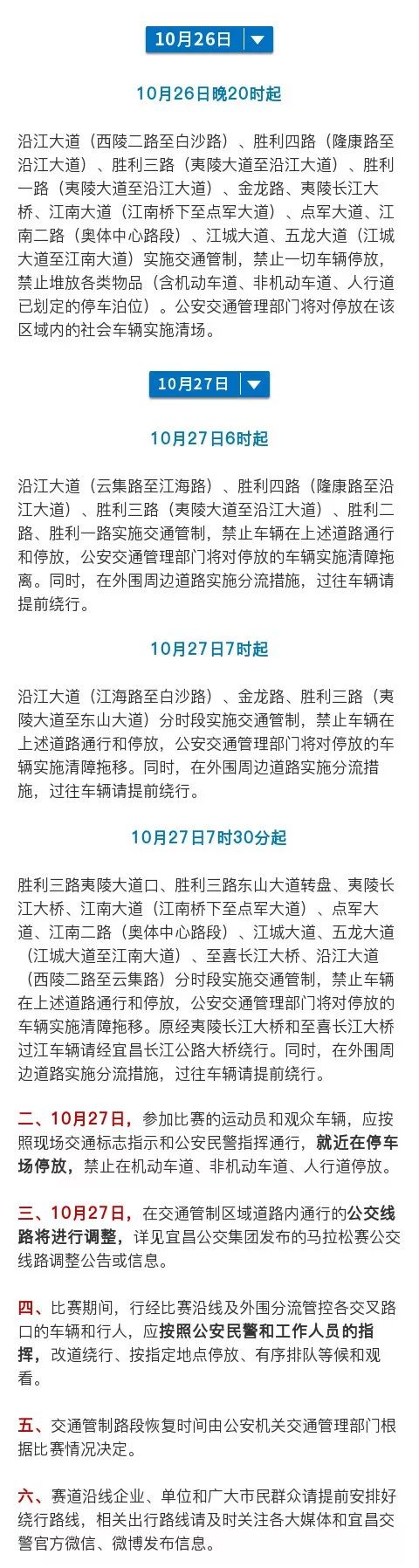 一、10月26日晚20时至27日15时,除持有《广汽传祺2019宜昌国际马拉松暨全国马拉松锦标赛(宜昌站)比赛专用车辆通行证件》的车辆外,其他车辆将分时、分段禁止通行和停放,过往车辆请提前绕行: