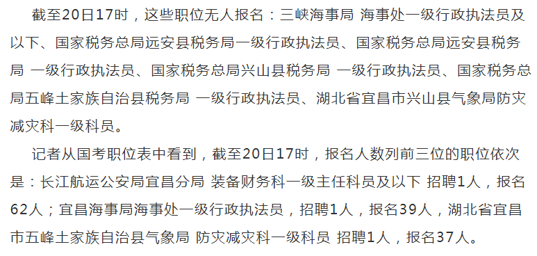 据统计,截至20日17时,国考职位中工作地点在宜昌的职位报名人数为808人,通过审核人数为658人,其中6个职位无人报名,7个职位审查通过为零,平均竞争比6.5。