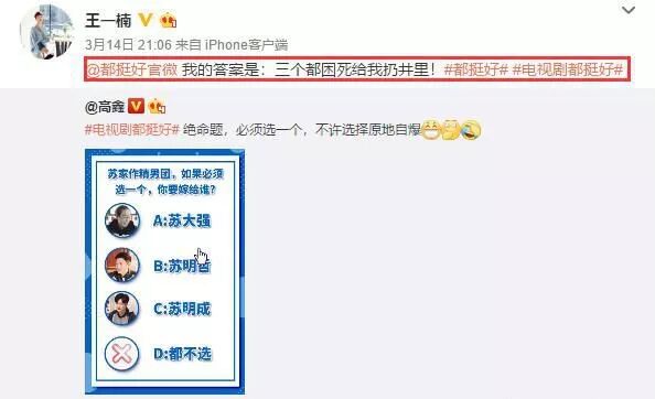 为照顾王一楠,高鑫花了四年时间陪其看病。两人的婚姻也传为佳话。《都挺好》热播,高鑫发文要从苏家三人帮选一个必嫁时,妻子王一楠还特意转发了丈夫的动态,并搞笑回应要都捆死扔井里,高鑫回复:“别啊,我还是可以抢救的。”满满的求生欲,也是十分有爱。