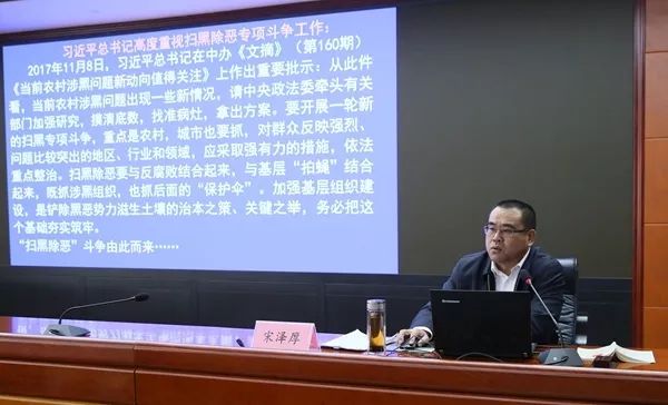 市院党组对此次培训十分重视,专程邀请了中央扫黑除恶督导组成员、高检院扫黑除恶专家库成员、辽宁省公诉检察业务专家、辽宁省检察院第一检察部四级高级检察官宋泽厚围绕扫黑除恶工作相关实务问题进行授课指导。宋泽厚检察官从扫黑除恶专项斗争的重大部署、相关法律规范和适用、黑社会性质组织犯罪和恶势力犯罪以及套路贷和软暴力犯罪的司法认定等方面,进行了详细的解读,为全市检察人员办理涉黑恶犯罪案件拓宽了办案视野,对重大的疑难复杂问题提供了具有参考价值的解决思路,对提升全市检察机关办理涉黑涉恶犯罪案件能力,起到了有效的促进作用。