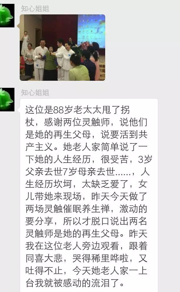 6月6日晚,再一次见证了灵触催眠疗愈导师韩升君老师个案的神奇!一个五岁时因发烧而导致小儿麻痹,10岁时因尾骨受到伤害只能坐轮椅生活的坚强美丽漂亮的女孩,自己从外地一路靠坐着电动轮椅来郑州参加学习,上下轮椅需要别人协助,经灵触催眠原创导师韩老师一个小时的个案疗愈,这个女孩自己从按摩床上慢慢下来,慢慢的一步一步的向前行走了,说话也较之前清晰了,女孩儿眼神灵动,笑容荡漾着拥抱着感恩韩老师,在场的三十多位弟子热泪盈盈,感恩的掌声连绵不断。