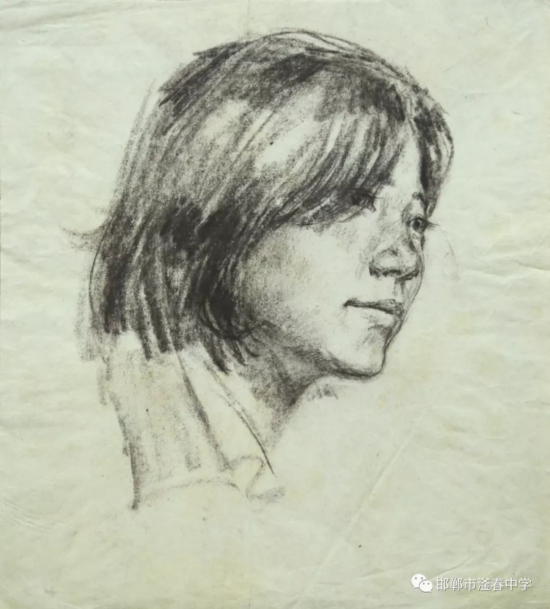 韦蓉,头像,三年级,纸本炭笔,39cm×54cm,1982年