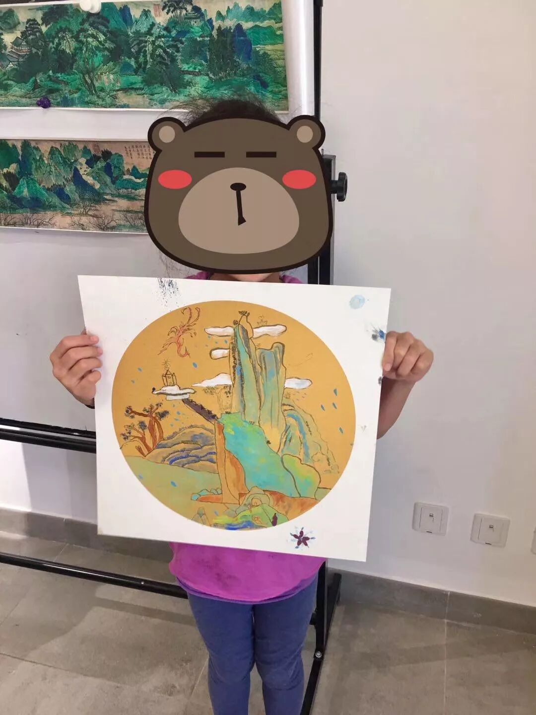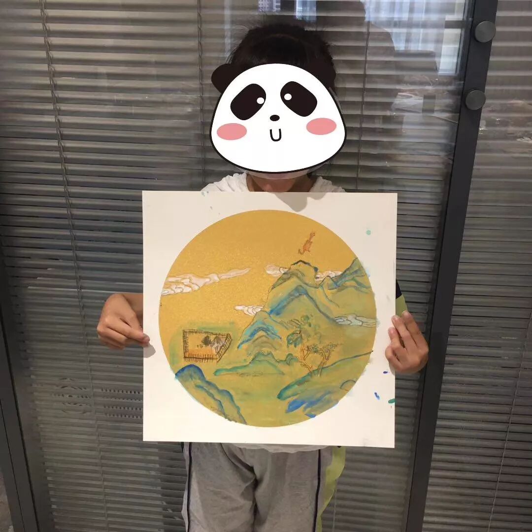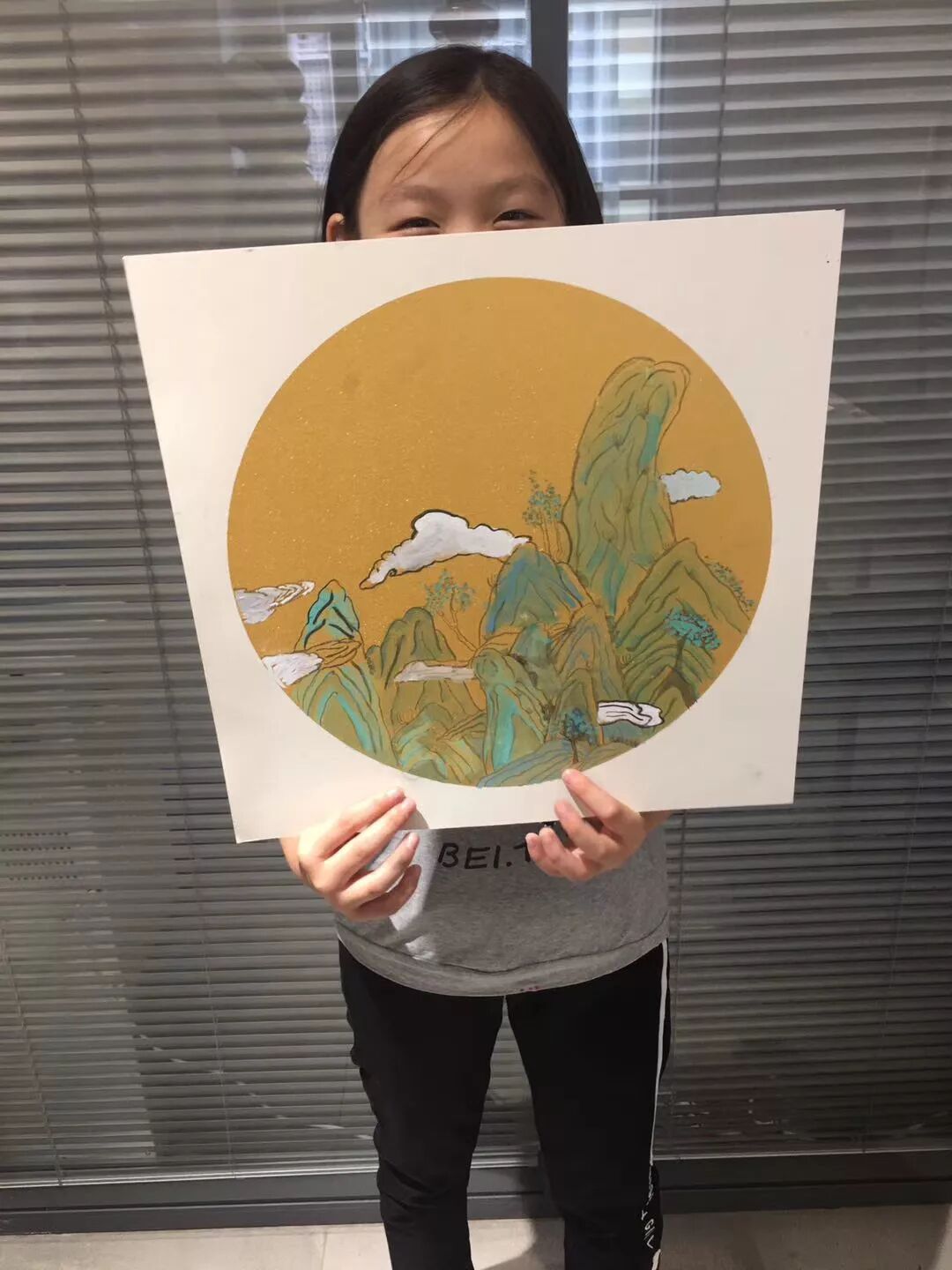 青绿山水自古是国画艺术中的小众,因画面罩染主要使用石青和石蓝两种矿物颜料而得名,又因材料稀有制作繁琐并且对画家作画能力要求极高,故大多悬于显赫朱门之家。青绿山水+泥金名为“金碧山水”,最为名贵。本次绘画孩子们都发挥出色,成就了一副佳作。