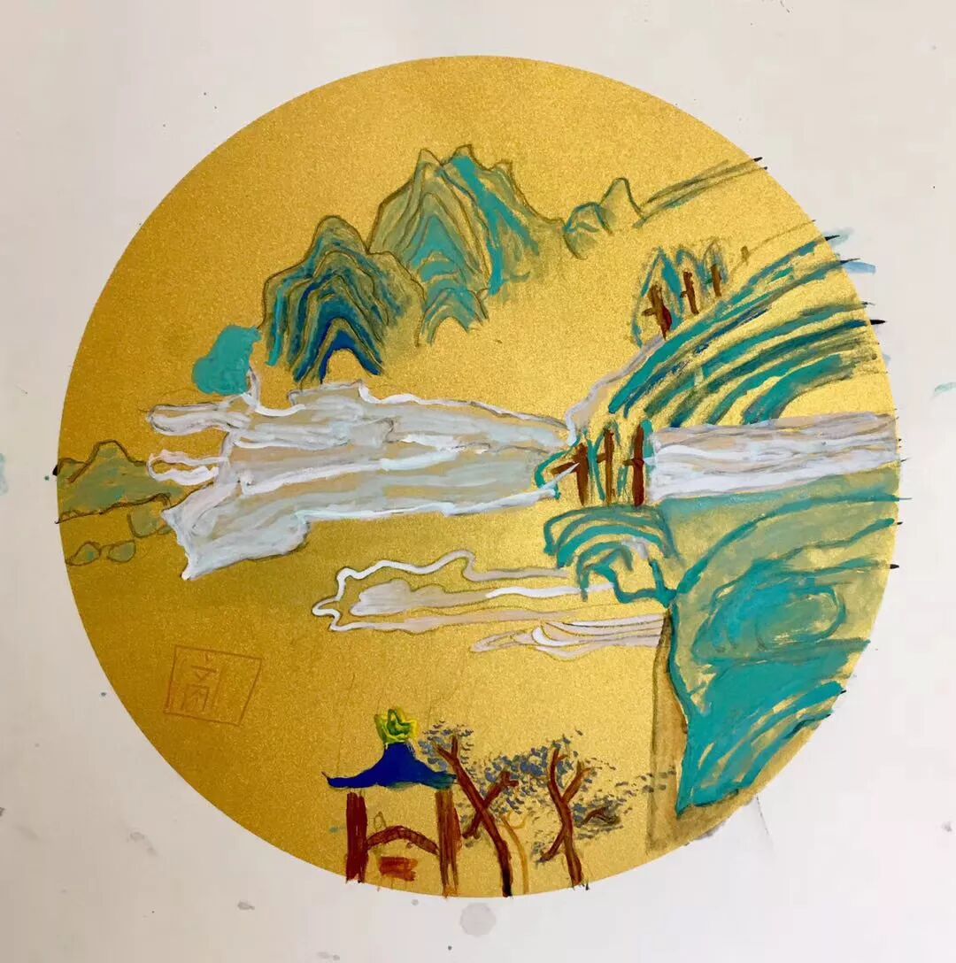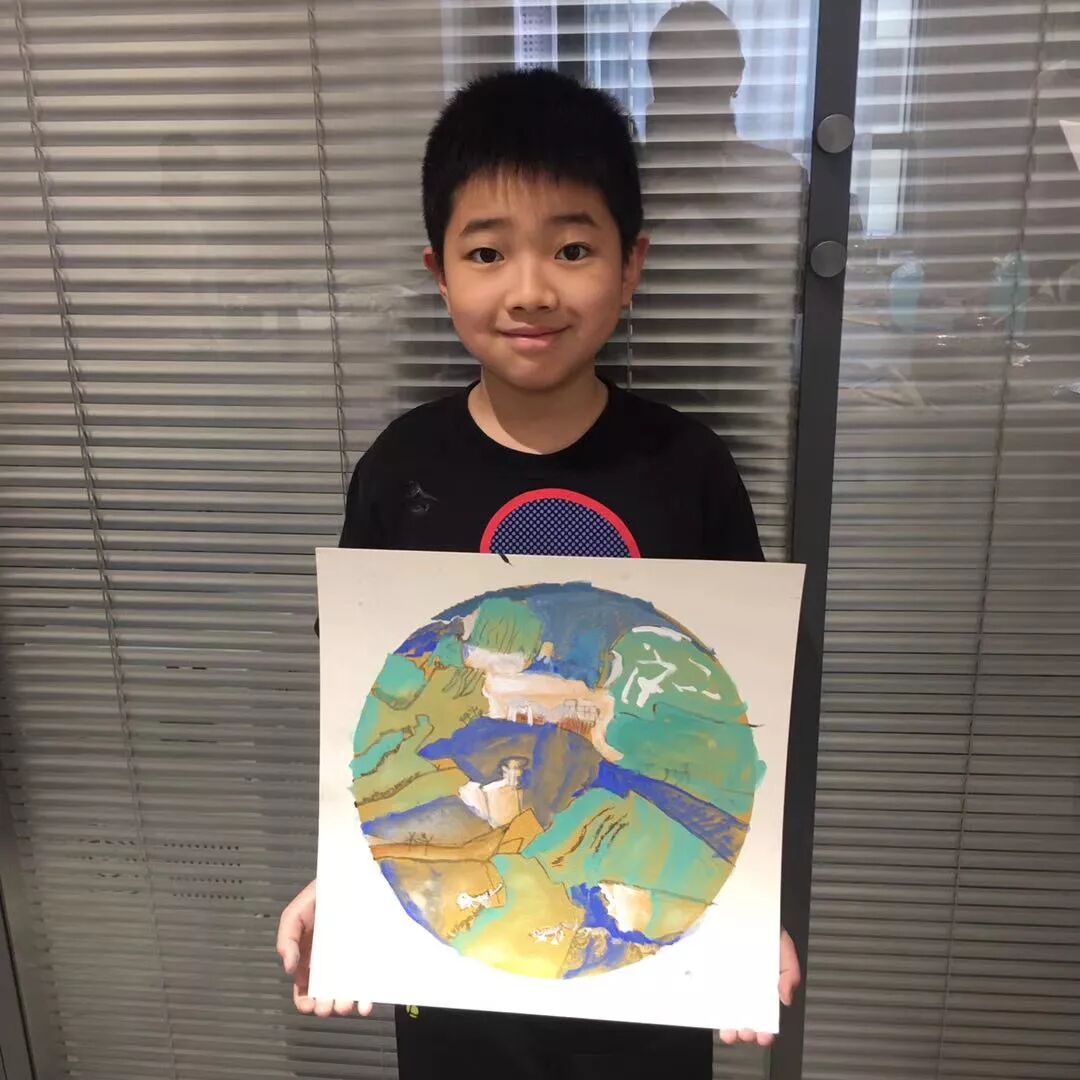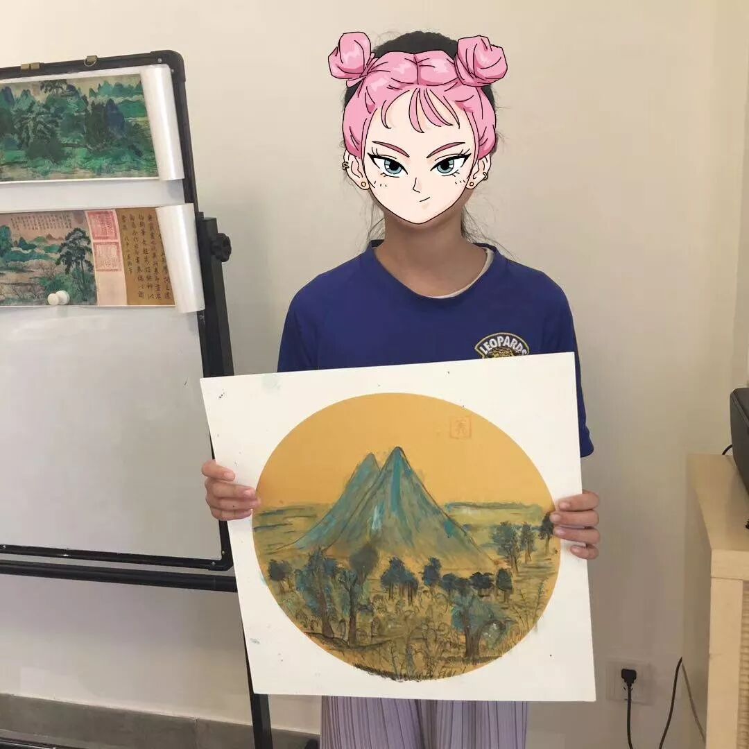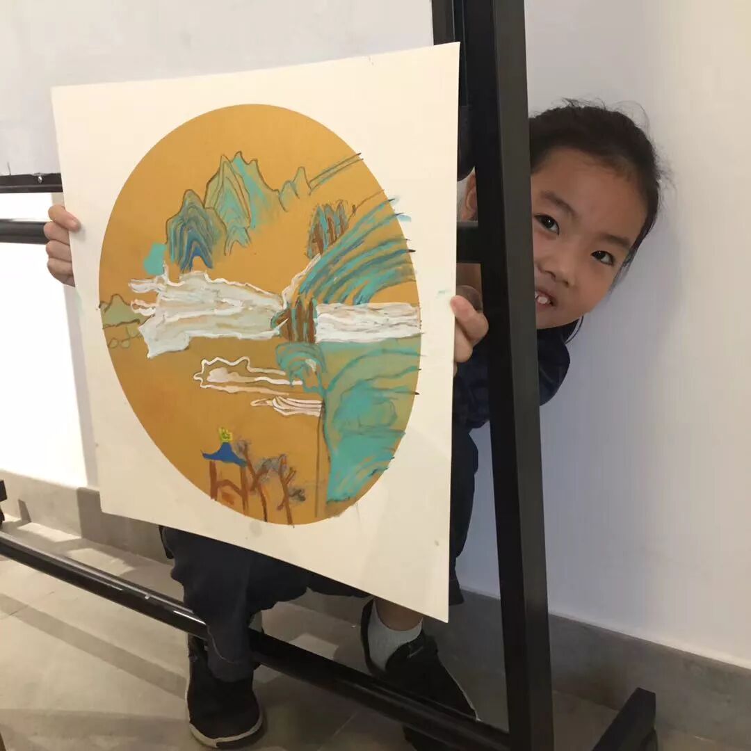青绿山水自古是国画艺术中的小众,因画面罩染主要使用石青和石蓝两种矿物颜料而得名,又因材料稀有制作繁琐并且对画家作画能力要求极高,故大多悬于显赫朱门之家。青绿山水+泥金名为“金碧山水”,最为名贵。本次绘画孩子们都发挥出色,成就了一副佳作。