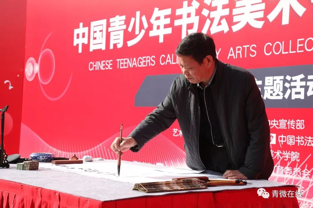 接着,中国书法家协会行书委员会副主任、中国书协理事王学岭上台为百米长卷作“题”——“中国青少年书法美术征集展示活动百米长卷创作活动”。