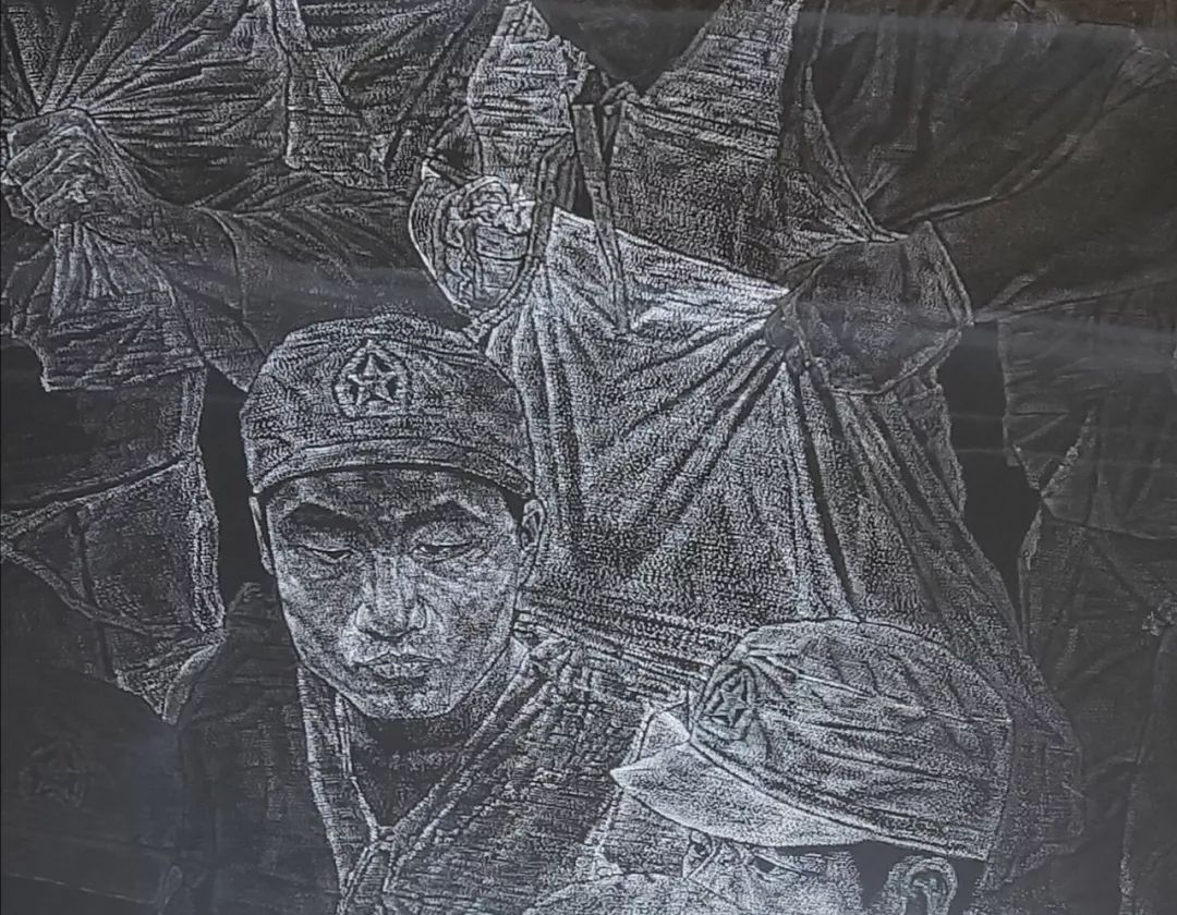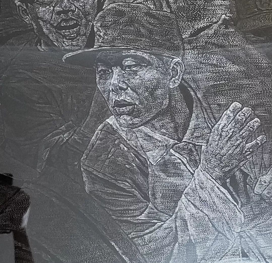《铸梦》这件作品是我在2017年进入工艺美院工作之后进行创作的一件较大尺幅的作品,宽400cm高240cm,作品由四部分组合为一个整体,用了一年半左右的时间。不锈钢表面不能修改是整个创作过程中最大的难点,在雕刻时,只能淡淡的一层层的推进,在不断反复的过程中进行调整,否则一旦刻的过深就无法弥补。进行《铸梦》作品的创作,对个人体力也是一个较大的挑战,整个雕刻的过程全程站立弓腰状态,在雕刻不容易表现的部分的时候,一个弓腰姿势保持三个小时是常有的事情。作品雕刻完成之后,因为没有过相似材料的装裱经验,将作品立起来具备展览状态也是经过了反复实验调整,画面要求平整度要高,当时咨询了多位老师,也进行了大量的实验,最终确定的是PVC板加不锈钢架的结构,要求误差要控制在最小。