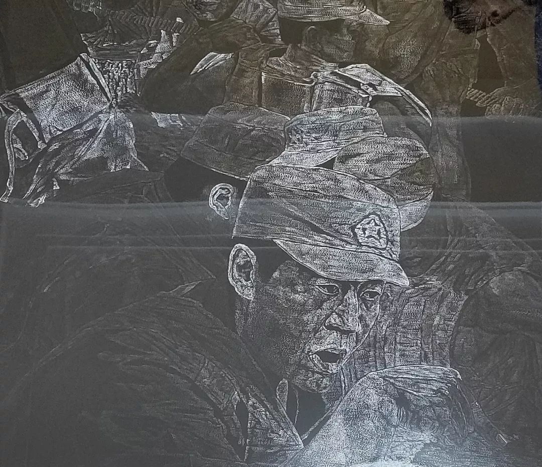 在不锈钢板上进行手工雕刻的创作方式是从2011年的时候开始的,经过在铜、铁、铝等多种类金属板材上利用磨、刻、高温火烧、强酸强碱腐蚀等多种工艺技法的反复实验与推敲最终确定的创作方式,当时用了将近半年的时间进行材料工艺技法实验。我利用这种工艺技法在不锈钢板上创作了风景、人物肖像等多系列作品。作品由于镜面的特性导致很难拍照,只能在现场才能感受到作品的完整效果。近几年对不锈钢材质进行了更多的实验探索,雕刻痕迹的方向不同反光则不同就会产生不一样的视觉效果,整个创作过程和最终作品效果都吸引着我继续探索。现在我仍然在利用此材质进行创作的实践,并感觉这种材质还有很多独特的效果可以挖掘,通过材料技法与创作主题的不断尝试,可以创作出更多吸引人的艺术作品。