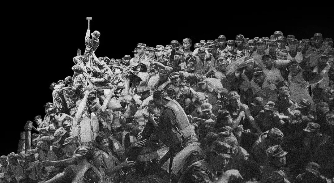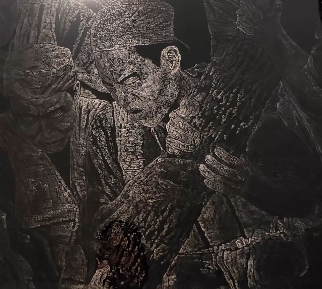 作品是在不锈钢板上利用手工雕刻的技法进行创作的。画面由近200多位抗洪战士在抗洪抢险第一线的战斗场面组成了山脉的形状,象征着抗洪战士用自己的身体构成了犹如大山一般的铜墙铁壁,与洪水抗争力量如山。画面左上角的军人用尽全力举起的大锤如灯塔一般照亮了周围,表达了抗洪精神鼓舞着所有人的创作理念。