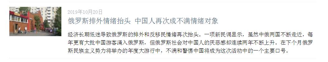 “某国之音”在10月20日晚发出了一篇报道,声称“由于经济长期低迷导致俄罗斯的排外和反移民情绪再次抬头。一项新民调显示,虽然中俄两国不断走近,每年也有大批中国游客涌入俄罗斯,但俄罗斯社会对中国人的厌恶感却连续两年不断上升”。