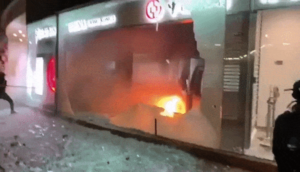 中国银行玻璃被砸得稀碎,营业厅还被放火: