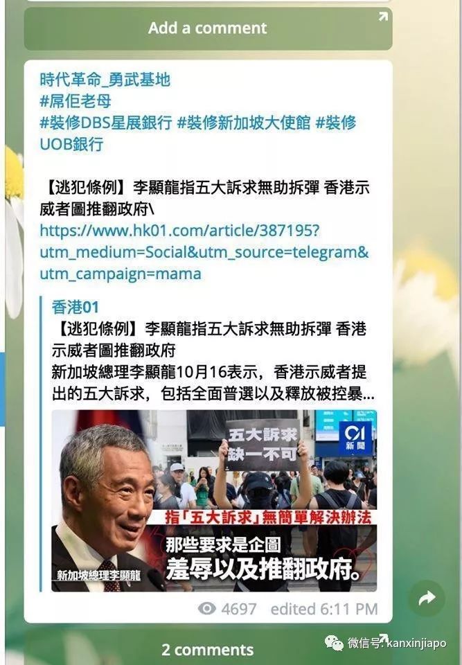 周五,网上就疯传一张疑似是香港示威者社交群组的信息截图,po出李显龙的言论同时,加了“装修”DBS星展银行、新加坡大使馆、UOB(大华银行)的标签,疑似要在这些新加坡驻港机构搞破坏。
