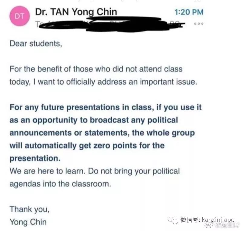 至于被“装修”的原因,是因为这位Tan(应该是姓陈)教授,给班上同学发邮件,让大家不要利用做课堂呈现的机会,进行任何宣传政治相关的公告或立场,否则整组将会得零分。