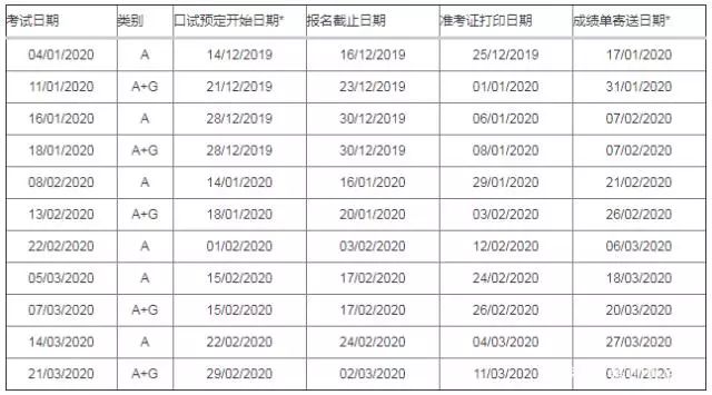 2020年1-3月用于英国签证及移民的雅思考试口试预定开始日期、考试报名截止日期、准考证打印日期和成绩单寄送日期