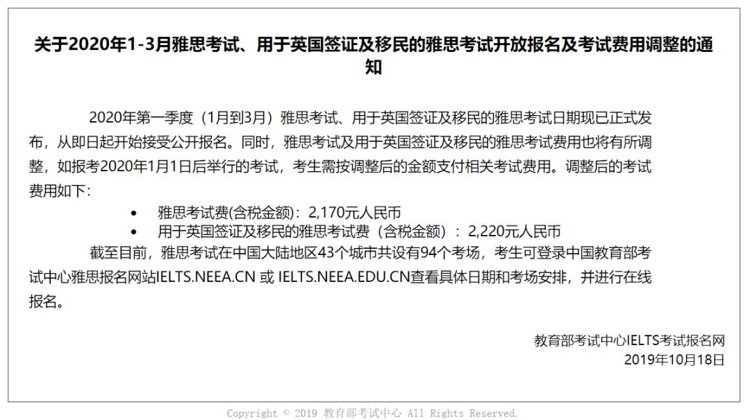 根据雅思官网公布的消息,考生如果需要报考2020年1月1日后举行的考试,那么考生将需要按照调整后的考试金额进行支付相关考试费用。