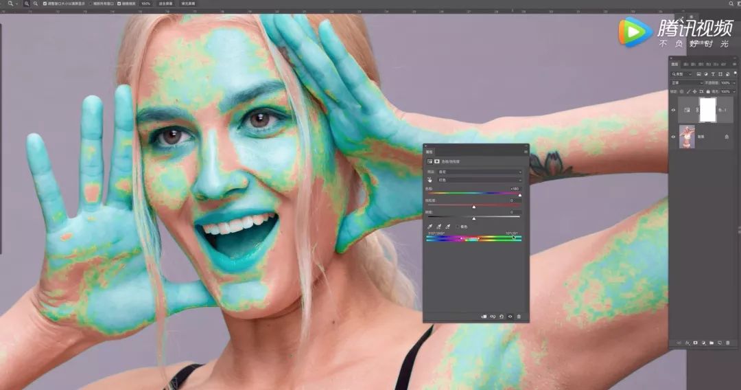 因化妆形式和目的不一样,妆面里的腮红眼影,唇色就不一样。我们平时追求的皮肤是红里透白的部分,我们做阿凡达统一肤色要避免破坏腮红,唇色,这时我们要用蒙版擦出来。
