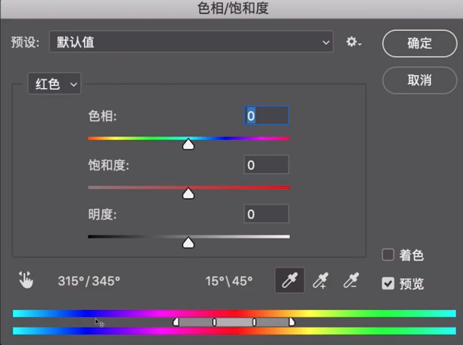 把色相拉到底,减少色域,把下面的滑块往右挪,得到偏红的选取。