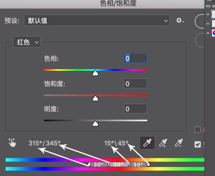 现在我们打开色相饱和度,左边是色环,也帮大家标注了刻度,0/360度是一个颜色。
