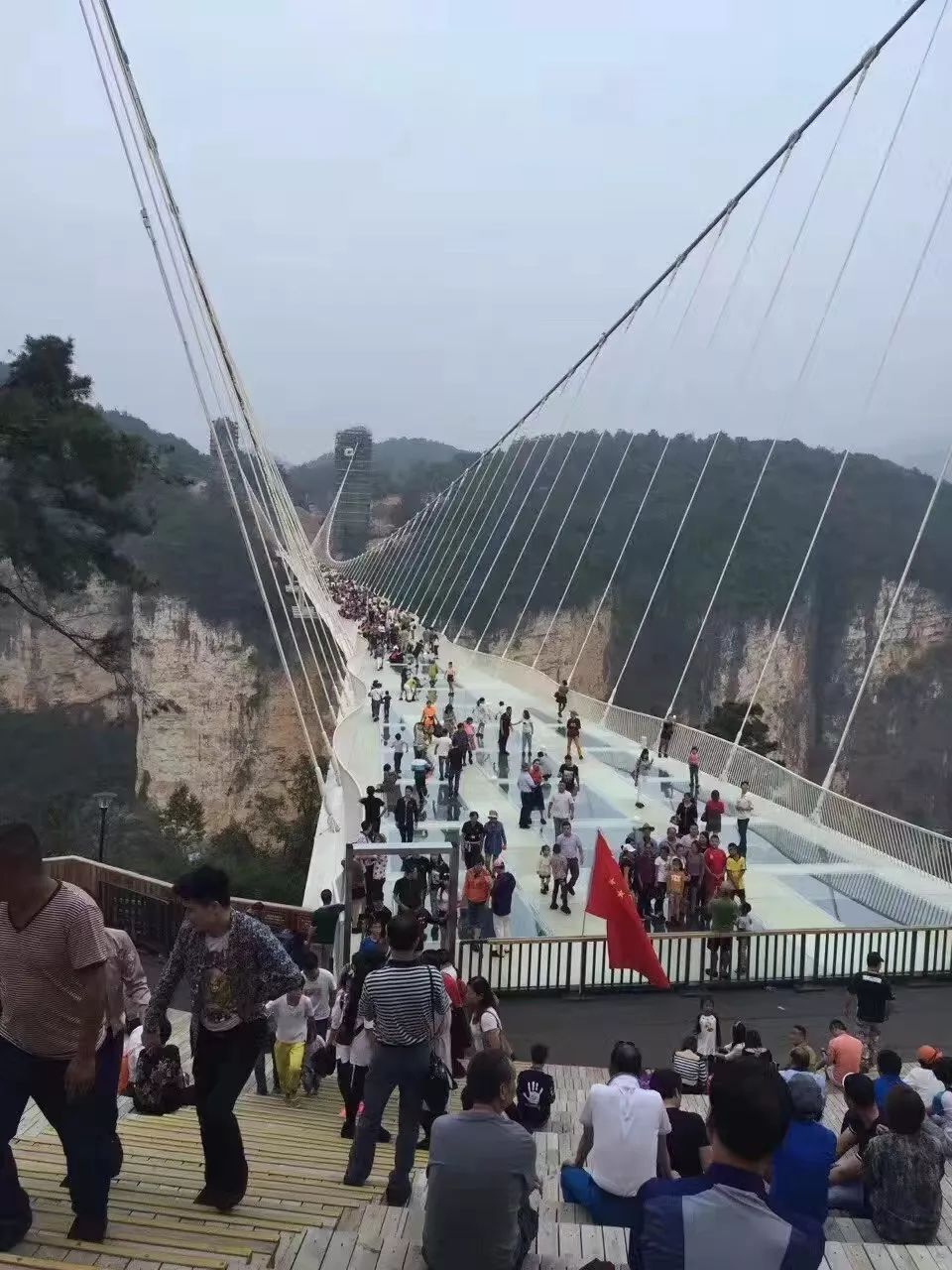 早餐后前往湘西地区最大的一家【土特产自选超市】,选择自己沿途所用的休闲食品,及心爱的湘西当地土特产,纪念品及馈赠亲友的礼品,满载而归。后赠送游览全球瞩目的世界最长、最高的玻璃桥——【张家界大峡谷玻璃桥】它目前是世界最高、跨度最长的全透明玻璃桥,玻璃桥总长约430米,宽6米,高300米,桥面全部采用透明玻璃铺设,桥中心有全球最高的蹦极台,整个工程无钢筋支架,是一种全玻璃结构的桥梁。此玻璃桥还是世界首座斜拉式高山峡谷玻璃桥。【温馨提示:若因不可抗拒的因素(包括玻璃桥景点因道路堵车、下雪结冰、景区关闭、景区无法预约等种种无法抗拒因素的原因无法正常参观),导致无法上桥游览,将更换为游览【宝峰湖】费用不增不减】(凡有心脏病、高血压、恐高症及醉酒和其他身体不适宜游览的,请勿上桥)。
