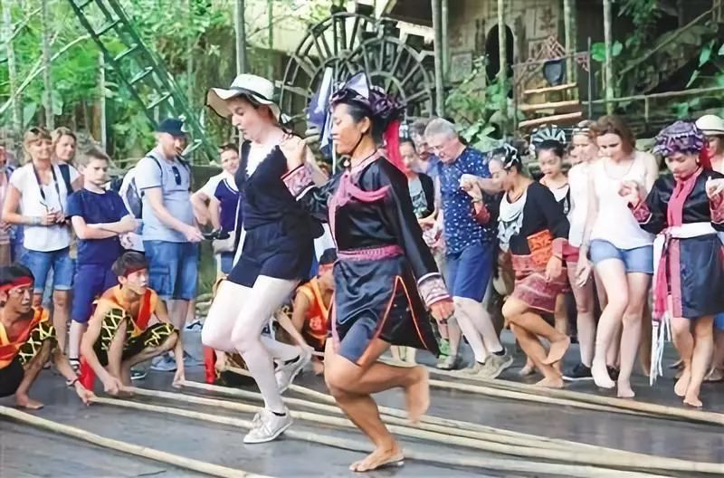 来自法国、比利时等国家的旅游经销商,在槟榔谷景区体验少数民族特色活动。