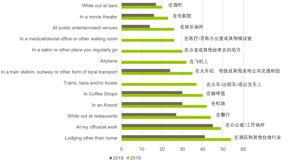 随着人们电量焦虑越来越厉害,消费者希望更多的地方能提供无线充电,这一点不足为奇。WPC 无线充电联盟的很多会员在全球各地的公共场所都安装了通过 Qi 认证的充电器。在公共场所安装的成千上万个设备,让消费者体验到了持续接入无线充电的生活方式,他们也随之提出了更多要求。消费者对无线充电的兴趣逐年增加,和2018年相比: