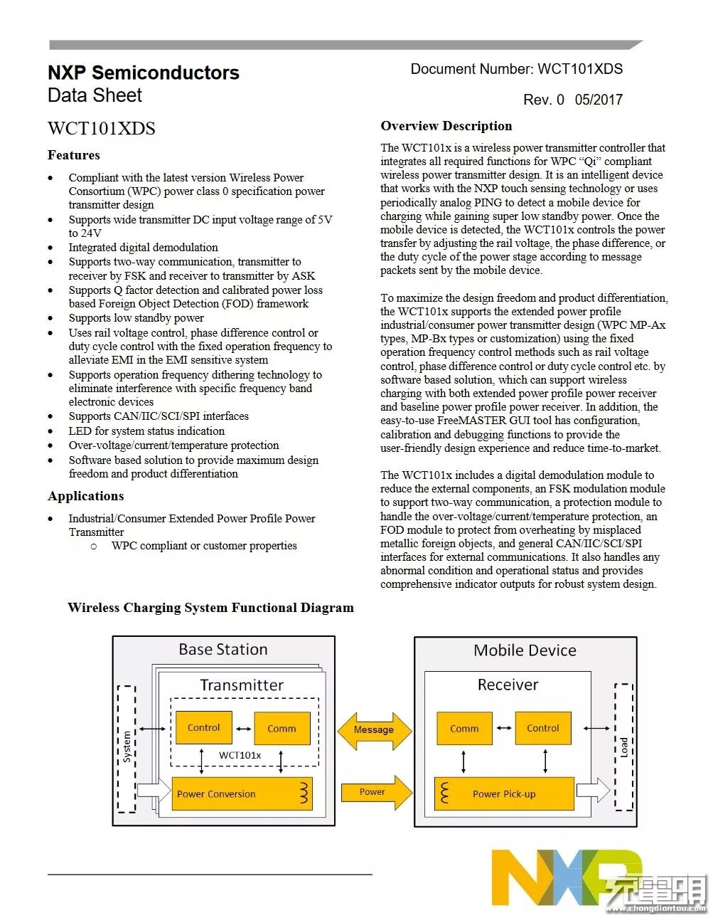 飞思卡尔freescale(NXP恩智浦)15W无线充电发射解决方案,型号WCT101X,支持宽电压工作范围,支持异物检测,支持多种通信接口,提供LED状态指示,过压,过流,过热保护功能。