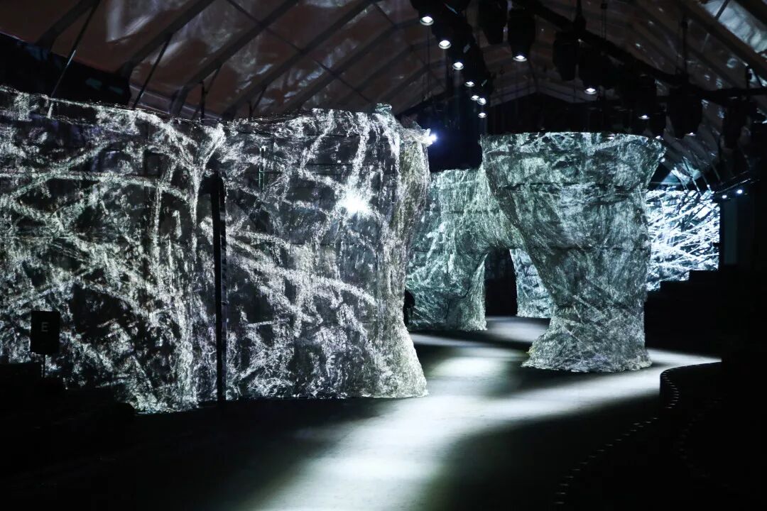 大秀的内场装置特别邀请到视觉艺术家钱泓霖来操刀,他结合当代艺术博物馆的前世今生,糅合磁场与羊绒的概念,用光电影像、柔软金属织网,构建环绕包围式的场域,打造出一个流动的羊绒磁场。