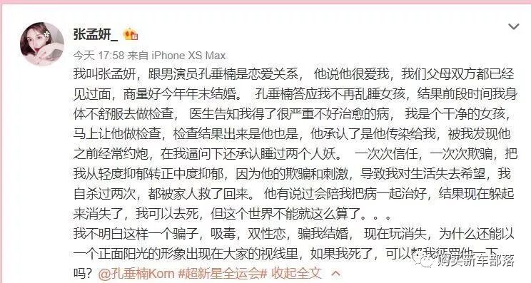 10月20日,一名自称是孔垂楠女朋友的女孩发文对他经行控告,这位女孩显露两年希望2019年关成婚,后果本人却被他沾染上了欠好的病,在本人的逼问之下,孔垂楠认可本人的私生存最腐败,恰是如许才把病沾染给了女朋友。