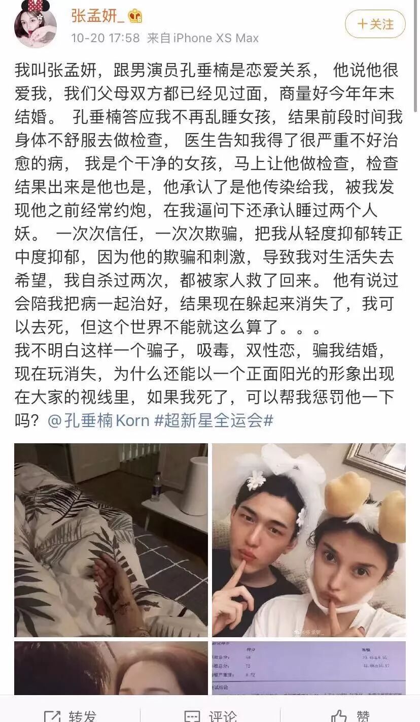 近日,一个叫张孟妍的网红发文,控诉男演员孔垂楠私生活不检点,还上过两个人妖,导致把病传染给了自己,医生说这个病一辈子都要治疗,自己因此得了抑郁症。