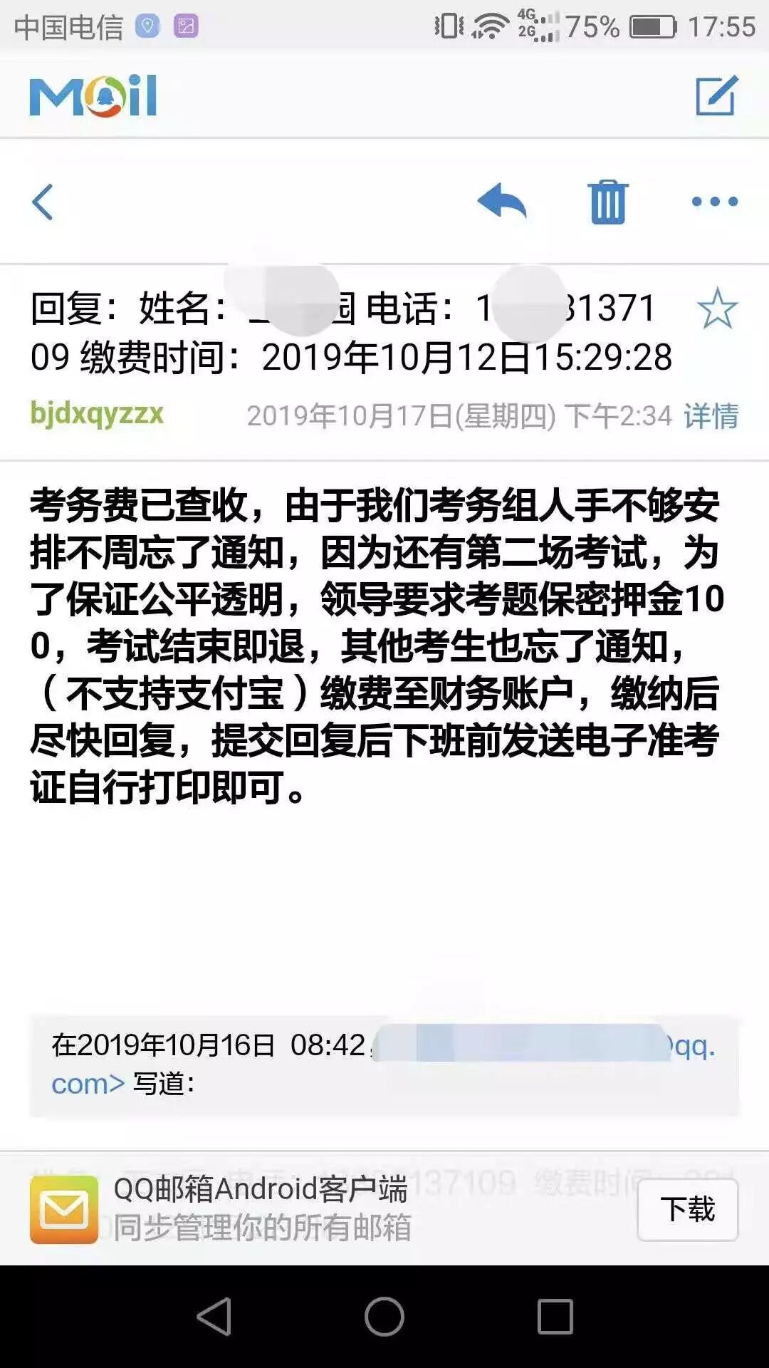 只要你提交信息,都会收到考试通知的,目的是收取100元考务费。然后就没有然后了,气不气,骗子做了这么多准备工作,只为诈骗你100元钱。