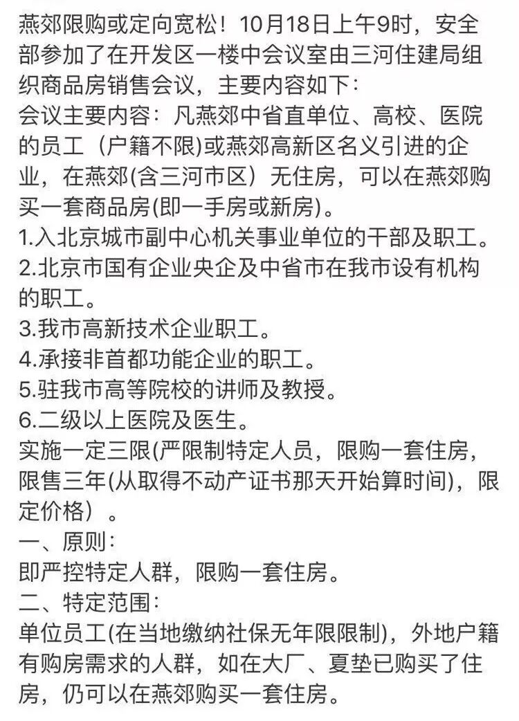 据北京一些房产号爆料,燕郊楼市也有望限购定向放松,凡燕郊中省直单位、高校、医院的员工(户籍不限)或燕郊高新区名义引进的企业,在燕郊(含三河市区)无住房,可以在燕郊购买一套商品房(即一手房或新房)。需要强调和说明的是,官方至今未有证实。