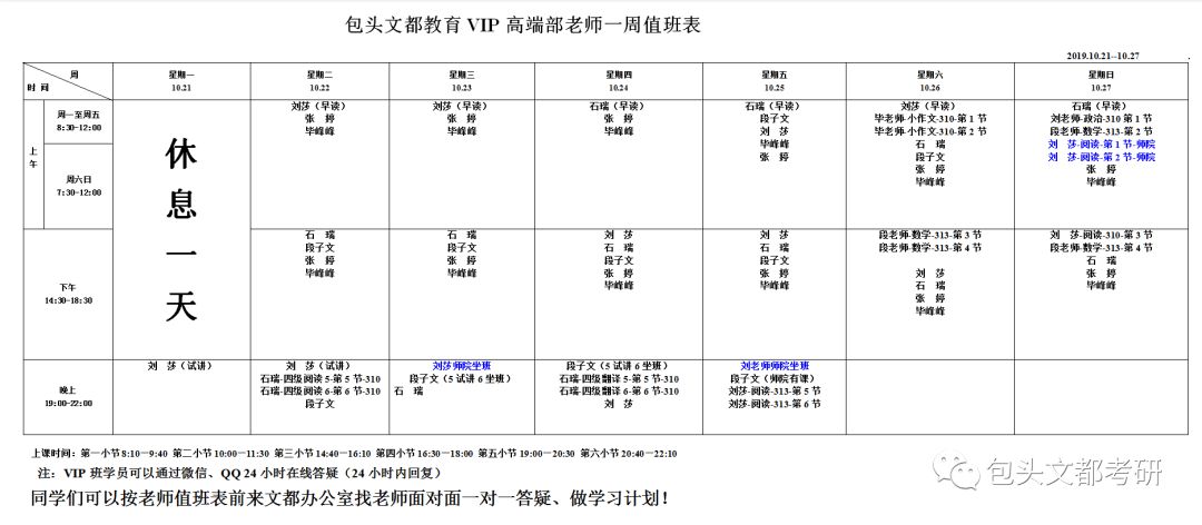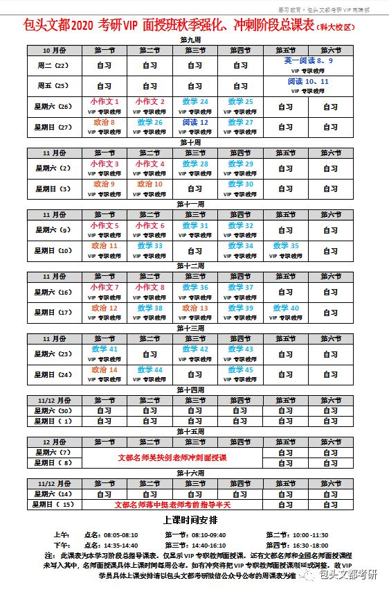 包头文都2020/2021考研 面授VIP班各校区周课表(10月21—10月27日)