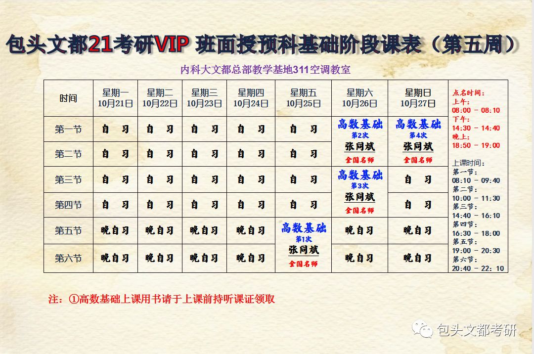 包头文都VIP21考研周课表授课地点文都总部(内蒙古科技大学西门正西100米天疆骊城底店赛习教育311教室)