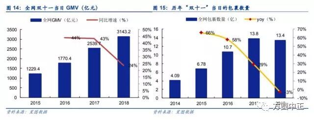 全网平均客单价同比上升 27%。2018 年双十一全网 GMV 达到 3143 亿元, 同比增长 24%;相应地,全网包裹的数量一改持续增长态势,从 2017 年的 13.8 亿个降至 2018 年的 13.4 亿个,对应的全网客单价从 2017 年的 184 元/单增至 235 元/单,全网平均 客单价上升显著。