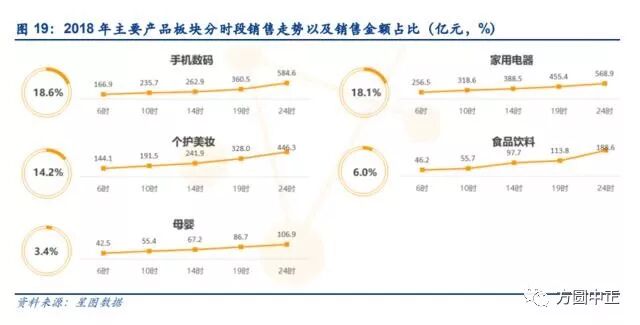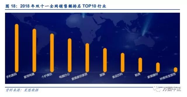 消费需求变更:消费结构改变,3C、美容需求大幅上升从 2018 年双十一全网销售金额来看,排名前五的行业分别是手机数码、 家用电器、个护美妆、电脑办公、家具家纺家居;其中手机数码销售金额达到了 585 亿元, 同比增长 164.5%,销售金额占比18.6%;家用电器销售金额达到了569亿元,同比增长10.9%, 销售金额占比 18.1%;个护美妆售金额达到了 446 亿元,同比增长 117%,销售金额占比 13.7%。