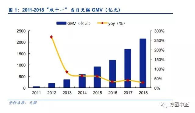 2018年天猫双十一最终成交额 2135 亿元,同比增长 27%。“双十一”电商节起源于 2009 年,2018 年是“双十一”第十个年头。自“双十一”电商购物节发起以来,当日全网销售额呈现持 续上升态势:根据天猫披露,2011-2017 年,天猫/淘宝双十一单日 GMV 从 52 亿元增至 1682 亿元,复合增速高达 78%;2018 年“双十一”,天猫平台最终成交额达到了 2135 亿元,同比增长 27%。十年以来,由阿里巴巴发起的双十一延续辉煌,单日 GMV 刷 新了 2000 亿元的新纪录。