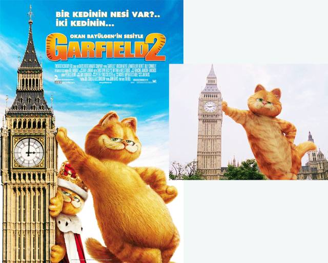 作为伦敦的地标性建筑,很多电影里都能见到大本钟。还有独一无二的加菲猫,海报也是以大本钟为背景的。