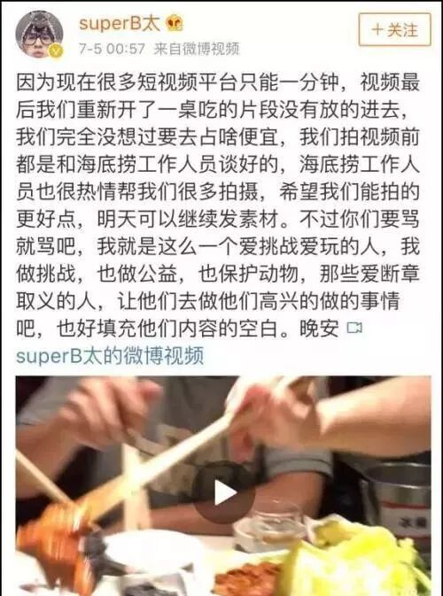 因为现在很多短视频平台只能一分钟,视频最后我们重新开了一桌吃的片段没有放的进去,我们完全没想过要去占啥便宜。我们拍视频前都是和海底捞工作人员谈好的,海底捞工作人员也很热情帮我们很多拍摄,希望我们能拍的更好点,明天可以继续发素材。不过你们要骂就骂吧,我就是这么一个爱挑战爱玩的人,我做挑战,也做公益,也保护动物,那些爱断章取义的人,让他们去做他们高兴的做的事情吧,也好填充他们内容的空白。晚安