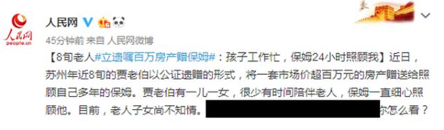 8旬老人立遗嘱百万房产赠保姆,称“孩子工作忙,保姆24小时照顾我”。近日,苏州年近8旬的贾老伯以公证遗赠的形式,将一套市场价超百万元的房产赠送给照顾自己多年的保姆。贾老伯有一儿一女,很少有时间陪伴老人,保姆一直细心照顾他。目前,老人子女尚不知情。