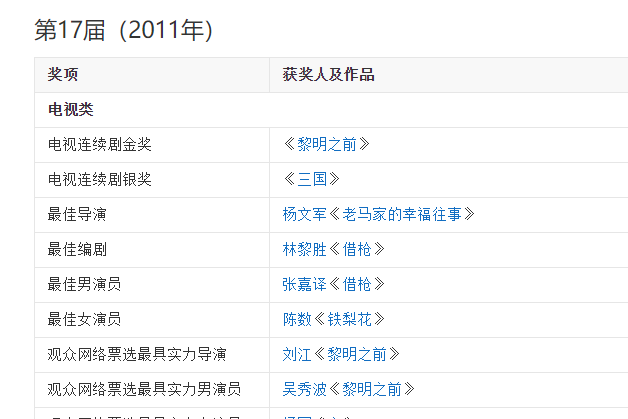 2011年第17届白玉兰奖,最佳电视剧金奖是《黎明之前》,银奖是《新三国》,最佳导演是《老马家的幸福往事》的导演,最佳编剧和最佳男主角都出自《借枪》,最佳女主角是《铁梨花》的陈数。反正这届白玉兰最大赢家,《黎明之前》和《借枪》。